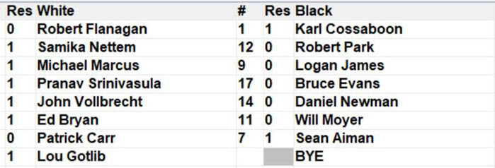 Some notable games last night. John Kula (1643) upset Sean Duffy (1954) and Faelan McDermott (1720) tied Greg Nolan (2048). More action next week for sure.