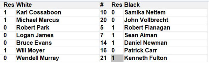 Ed Kline and Jim Larsen drew, Dirk Troltenier beat Nate Bryans, Ariv Debmisra won over Aaron Biscoe, and Joe Mucerino beat Preston Ladson.
