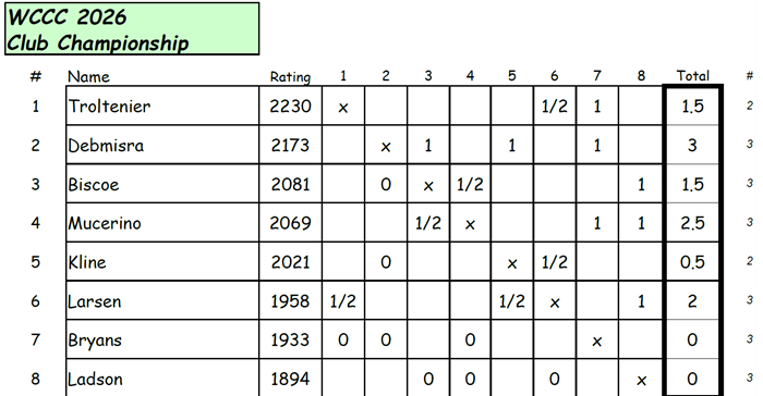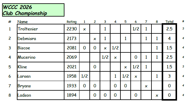 Round 3 of the WCCC Championship was played last night and Ariv Debmisra remains the only undefeated and untied player. Dirk Trottenier, Joe Mucerino, and Jim Larsen are also undefeated.