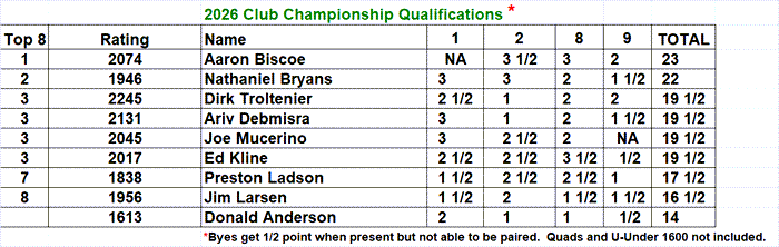 In 2005, a rule was established that you had to play 12 games to qualify to play in the club championship. Over the years we modified it to limit the field to the top 8 Open Section players based upon the number of wins accumulated over the year.