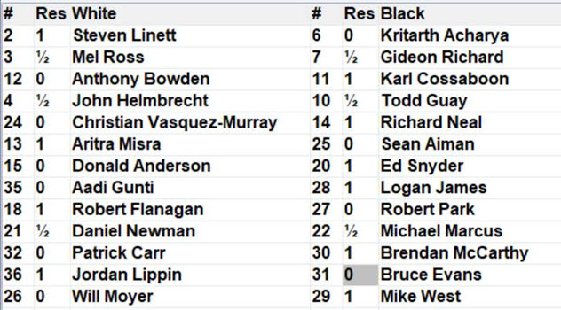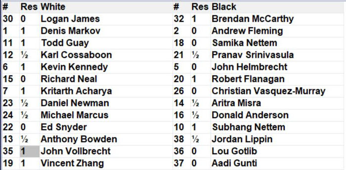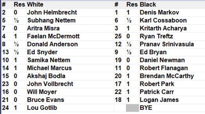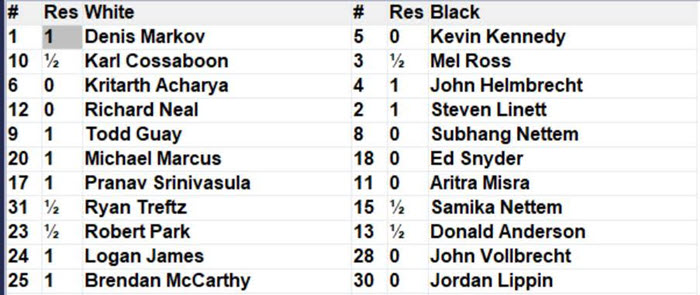 More fireworks last night. Pranav Srinivasula (1506) had a nice win over Aritra Misra (1643). Ryan Treftz (UNR) collected his first over the board game win against Samika Nettem (1517). And Robert Park(1400) got a draw by repetition against Donald Anderson (1600). More details here!